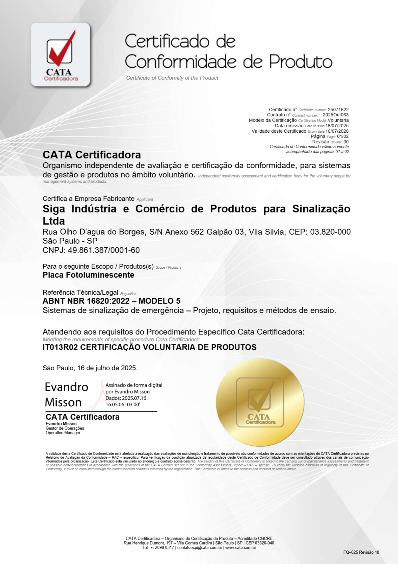 Placas com Certificado de Conformidade de Produto CATA, atendendo à ABNT NBR 16820:2022.