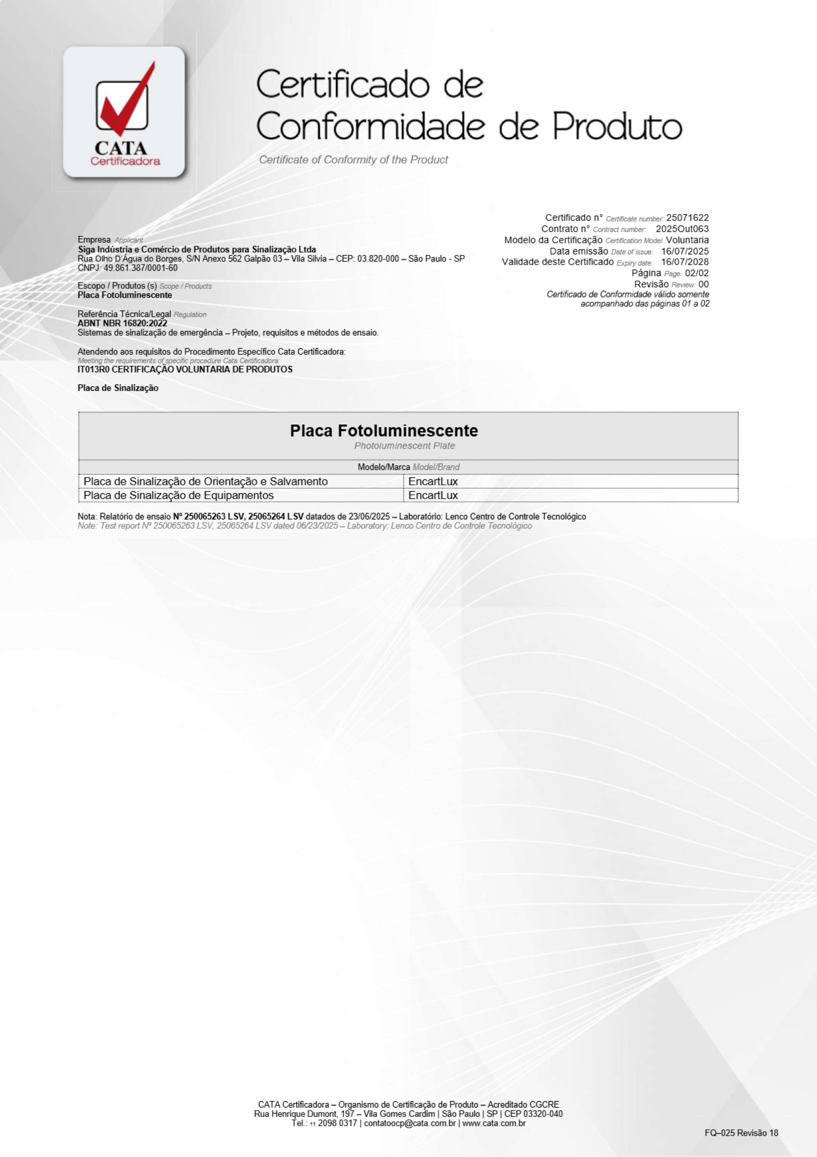 Certificado de Conformidade (CATA) para Placas Fotoluminescentes Encart'Lux